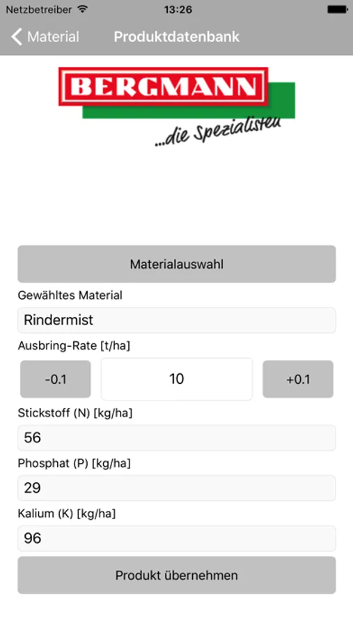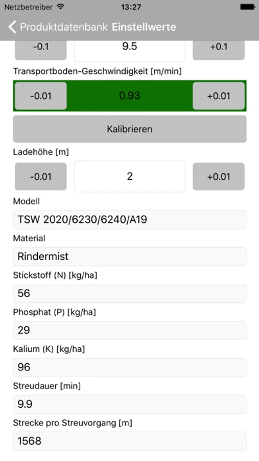 Typical material like lime, manure, compost or others can be chosen from the integrated product-database. Basic properties (density, dosing wall height…) will be loaded and used automatically. After choosing the material and application rate, the App will show how much nitrogen, phosphate and potassium will be spread per hectare. Also, the App offers an easy tool to check the maximum amount. New material with all properties can be created by the user and existing material can be changed.