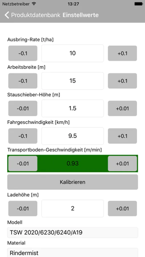 With the BERGMANN setting app it is possible, to calculate the target speed for the scraper floor or for the drive speed for the BERGMANN-spreader depending on the application rate.