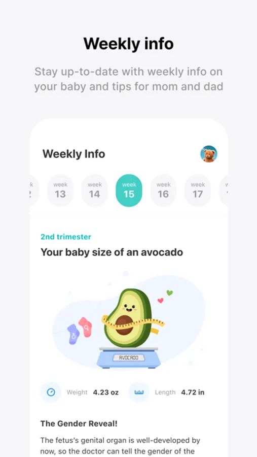 • Check all the important milestones during your pregnancy, such as medical check-ups for you and your baby, body changes, and growth information!