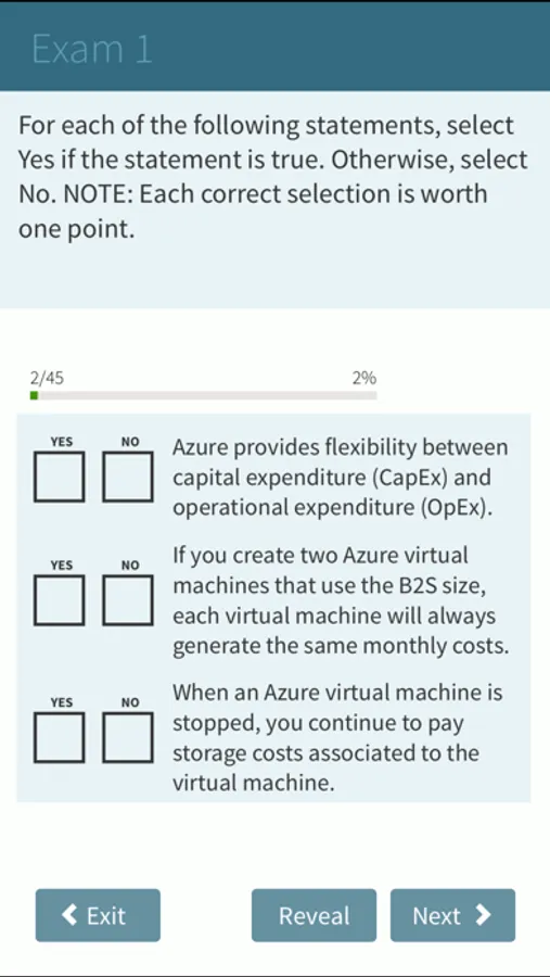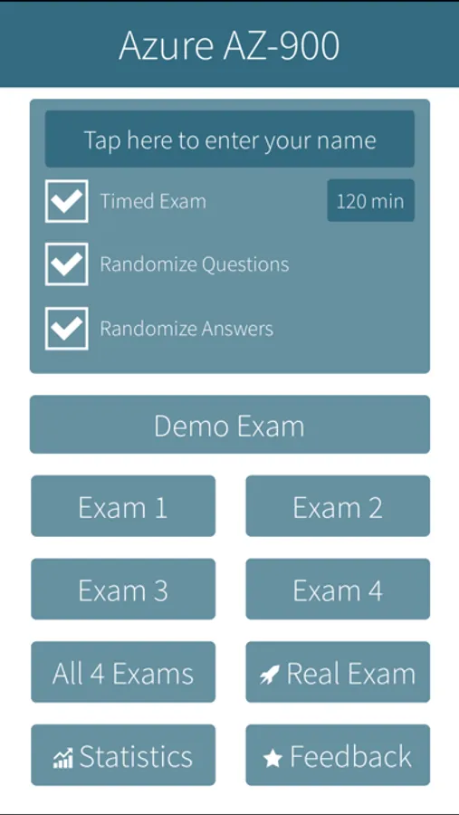 The app contains a "Full exam" consisting of all 4 exams containing 180+ questions. A Real Exam simulation is also included containing 50-60 questions featuring all the realtime features to simulate the closest similarity to the real Azure AZ-900 exam.