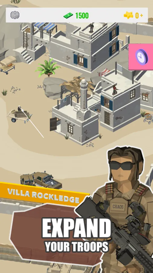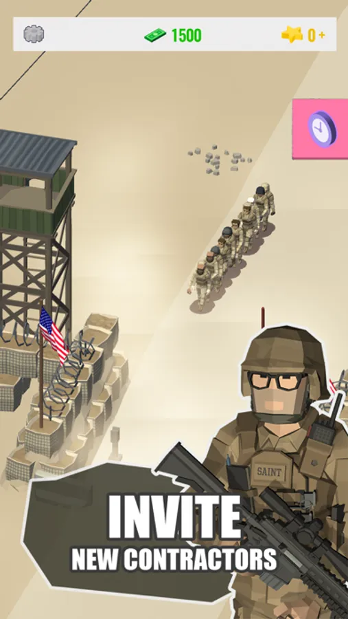Complete missions and get gems to help you grow your warfare business faster. Retire old soldiers and recruit new ones. Use tons of random bonuses and keep fighting. Put all of those bad guys in prison!