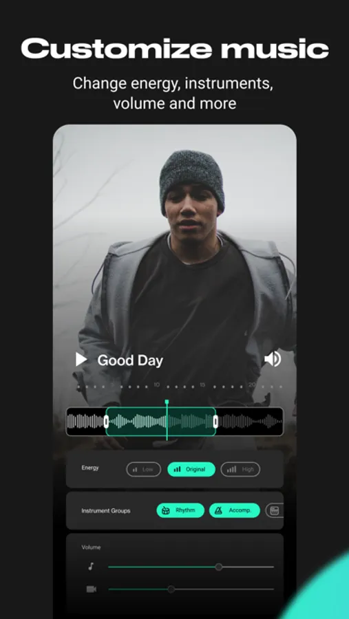 Go from song to soundtrack by using the power of AI or easily customizing music with our revolutionary app. Adjust energy, instruments, vocals and volume to get the perfect music vibe for your video.