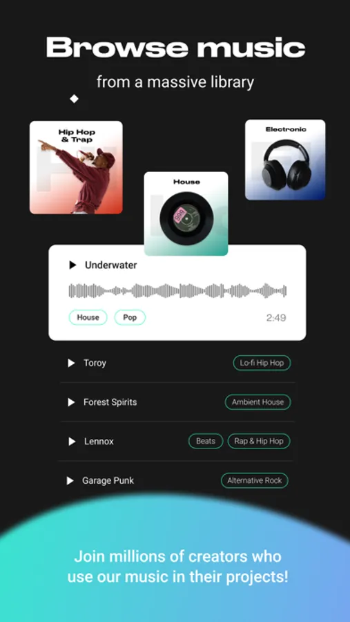 - Select a song or let the AI recommend you one in no time: Filter music by genre, mood, theme and energy to find the right song faster.