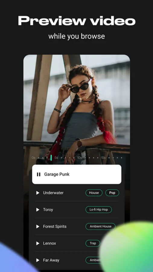 - Preview royalty-free music with your video all in one place: Instantly customize and adapt music for your video or digital project - all without leaving the app.