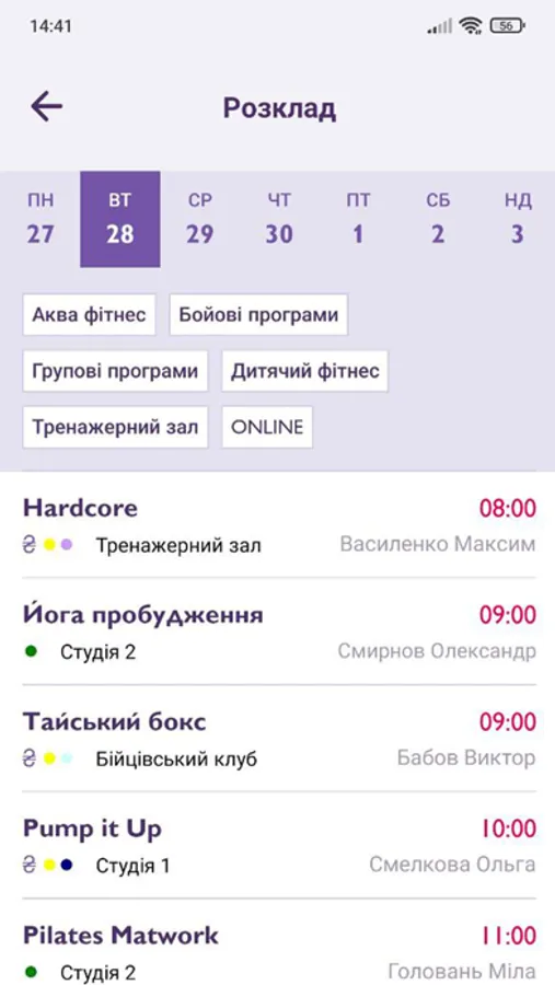 - самостійно записуватись на групові тренування, також при необхідності їх відміняти