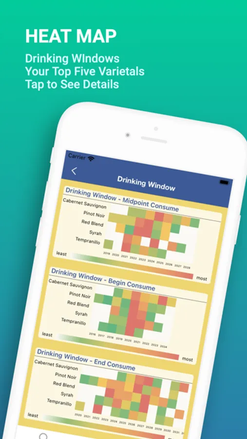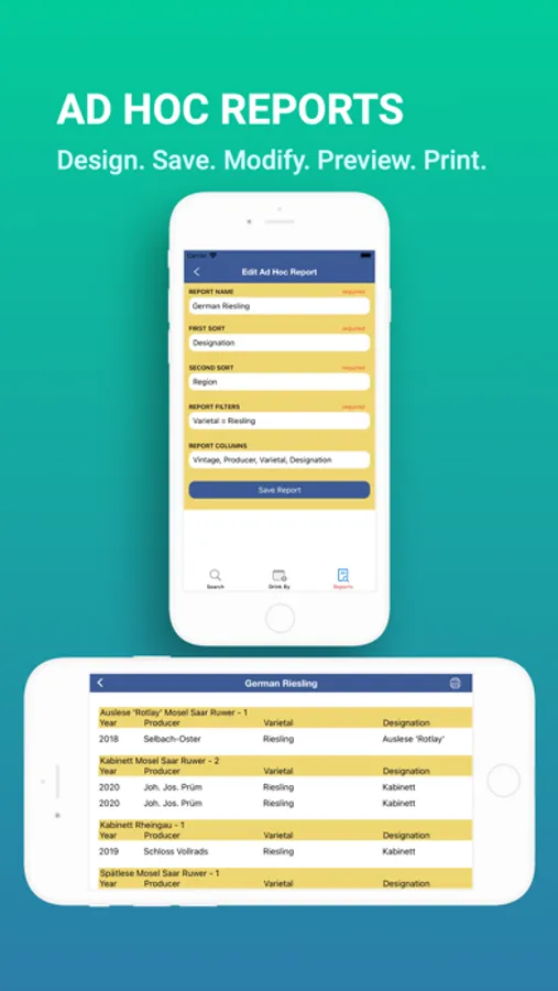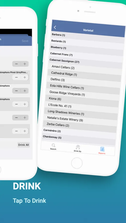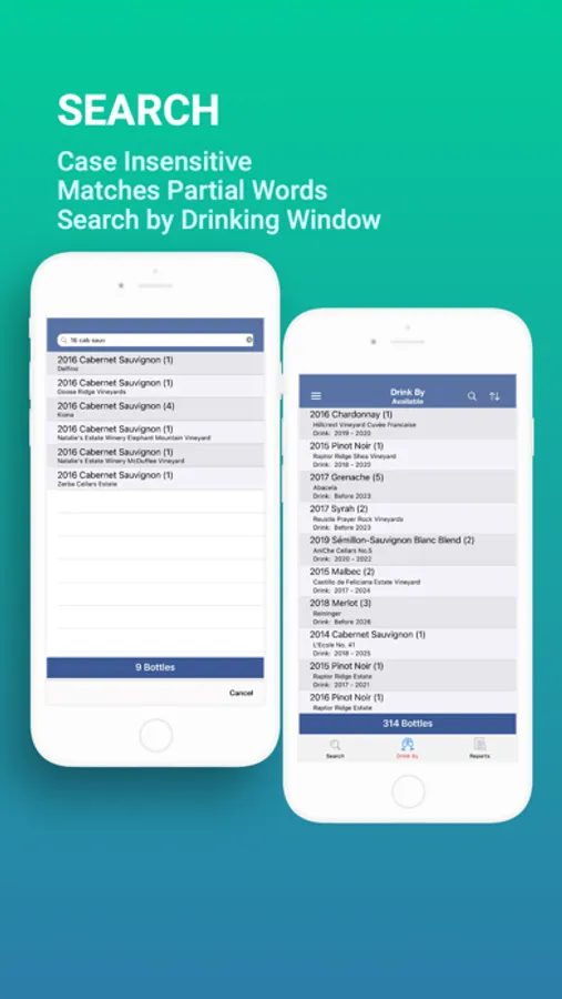 Searches are case insensitive and understand partial words. Search for wines by producer, vintage, varietal, vineyard, AVA, designation or country. Sort by vintage and varietal or choose to sort by producer, varietal, or location. Use the drink by report to help you choose to age or drink your wines wisely. Press and hold a wine to share searches with other apps.
