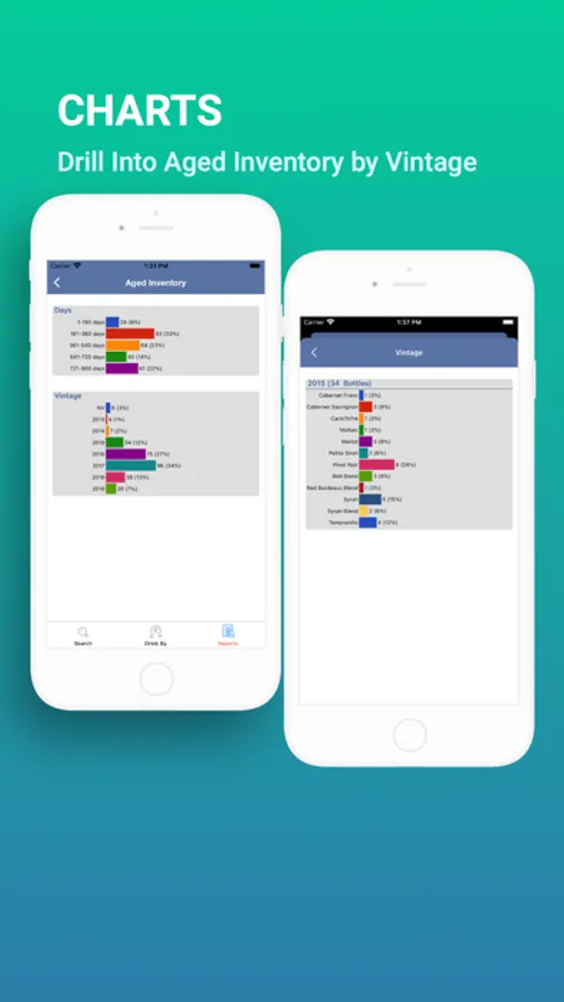 Charts for Aged Inventory, Vintage, and Varietal display when using the Aged Inventory Report.