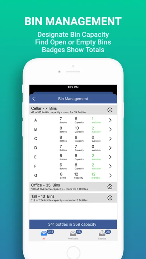 Set the cpacity of your bins. This feature compares the capacity and the contents of your bins. Quickly discover where you can add more bottles. Capacity syncs across all your Apple devices using your iCloud account.