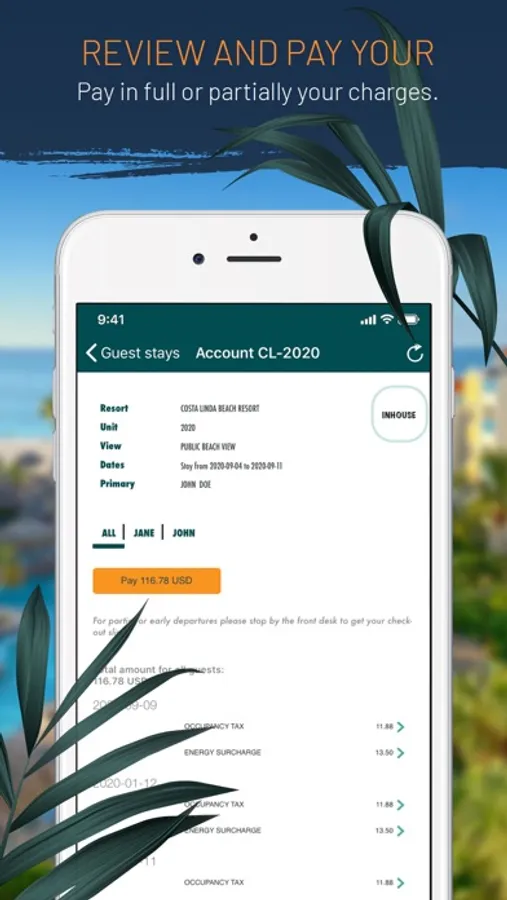 By using this App, keeping tabs on all your vacation transactions is easy and the results are immediate. You can register the members of your travel group prior to arrival. During your stay, check all your purchases and orders and confirm them the moment you make them. Before your checkout, you can even use the App to pay your bill with your credit card.