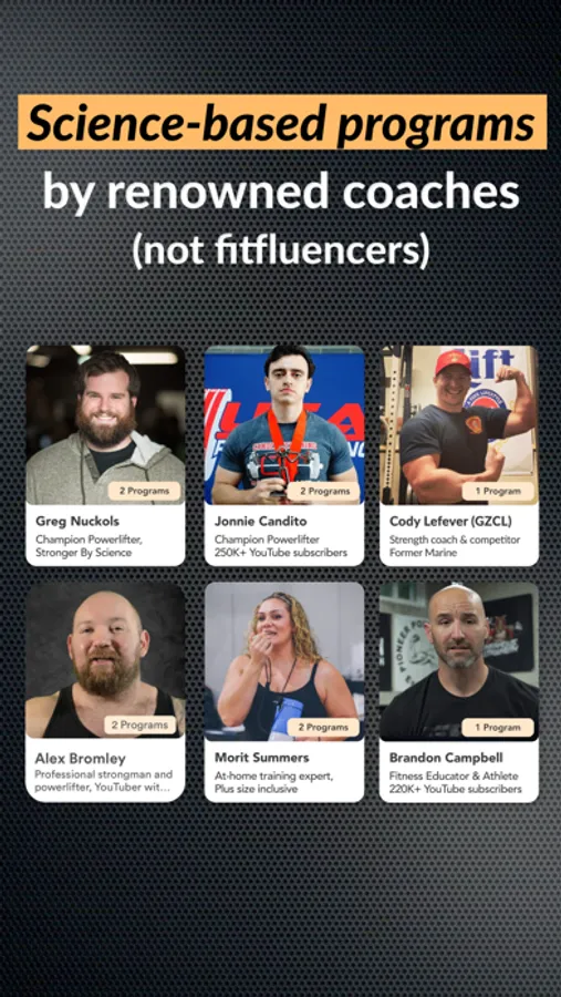 Boostcamp partners with world-class coaches (not influencers) to create science-based workout routines, with auto-weight progressions, 1RM onboarding, video exercise demos, and tools like rest timer and plate calculator. We have 40+ programs for bodybuilding, powerlifting, powerbuilding, general strength training, and at-home fitness.