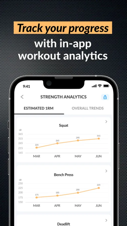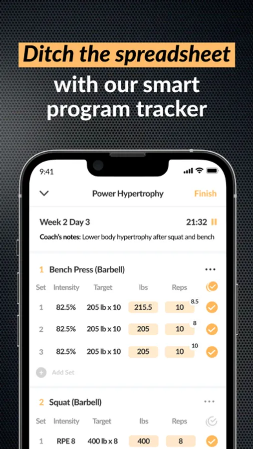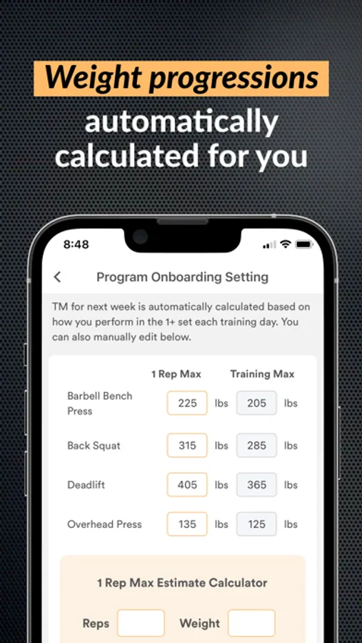 • Personalized onboarding with 1 Rep Max entry and calculations