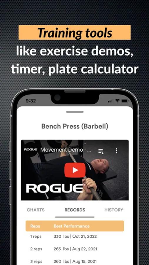 • Built-in workout timer, plate calculator, 1RM calculator, and workout notes
