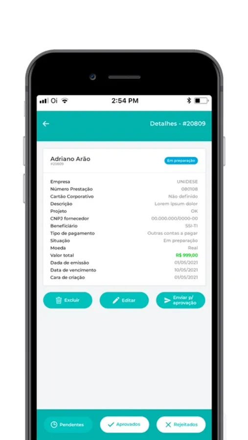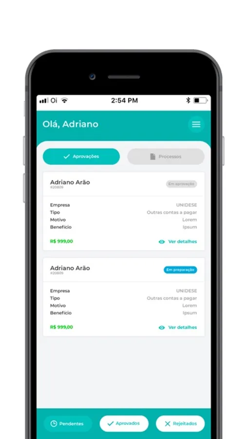 O objetivo do aplicativo é aprovar os processos de pagamento dos usuários empresariais, como despesas de viagens, adiantamentos, despesas fiscais.