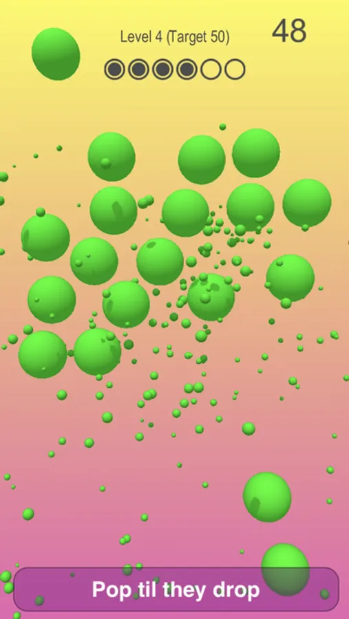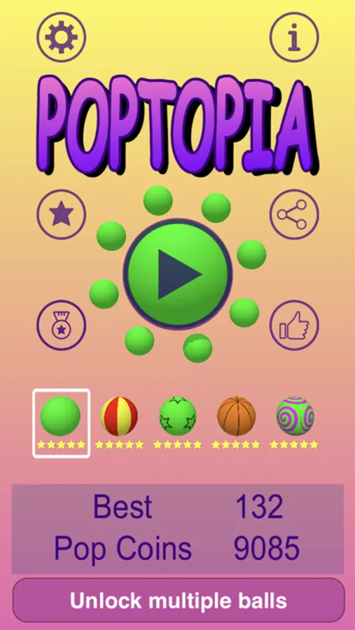 Poptopia is a simple tapping mobile game where you try and survive for as long as possible by popping each falling ball before it hits the ground. The balls multiply making it harder and harder to survive, if you hit the target score you'll progress to the next level. Its super easy and quick to play but most of all its loads of FUN.