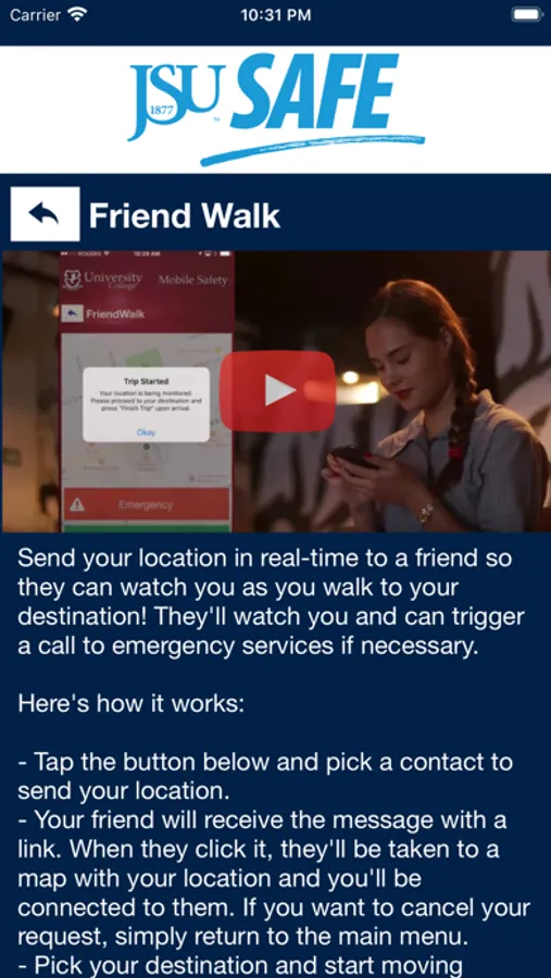 - Friend Walk: Send your location to a friend through email or SMS on your device. Once the friend accepts the Friend Walk request, the user picks their destination and their friend tracks their location in real time; they can keep an eye on them to make sure they make it safely to their destination.