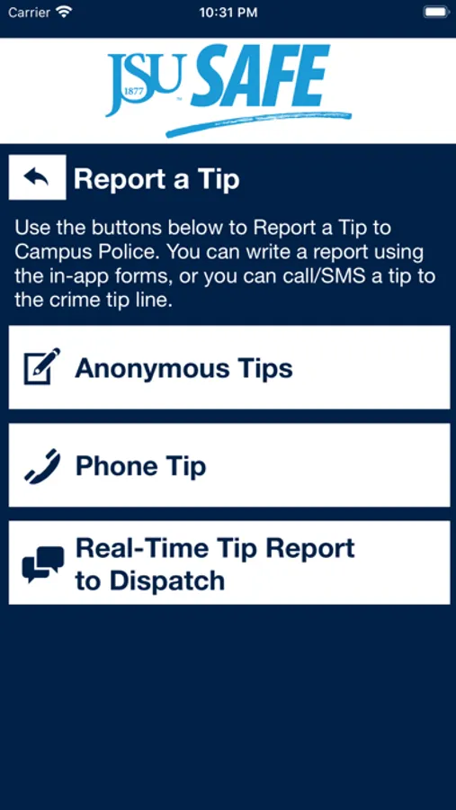 - Tip Reporting: Multiple ways to report a safety/security concern directly to JSU security.