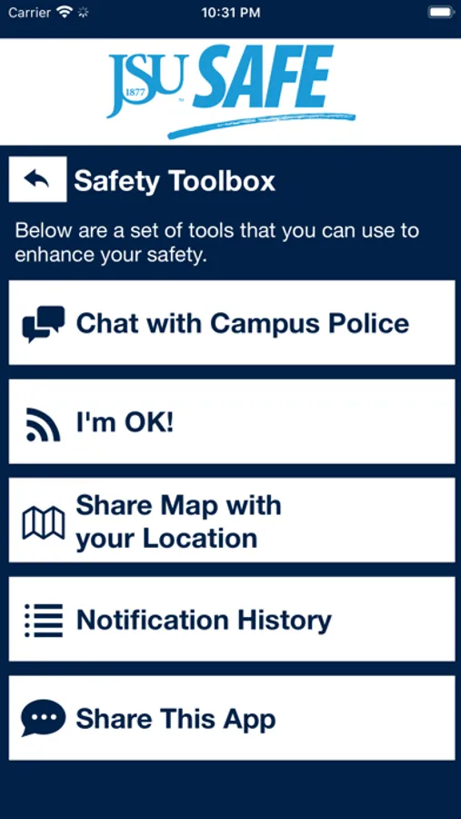- Chat with Campus Police: Communicate live with safety staff at JSU via chat.