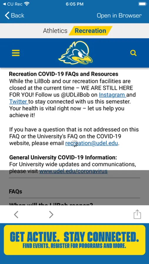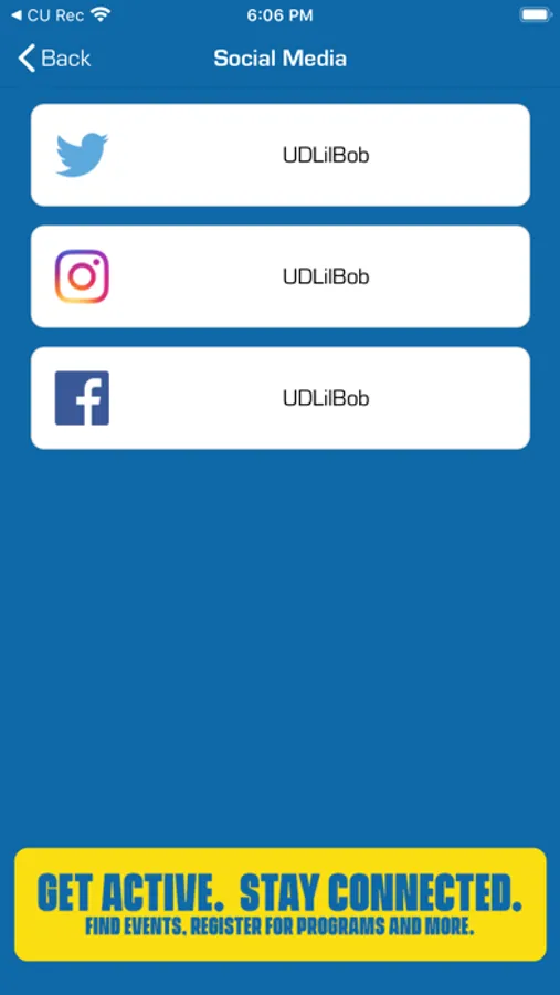 The official app of the University of Delaware Recreation Services. Download the app for easy access to UDLilBob hours of operation for the building, pool, and climbing wall. Register for fitness and CrossFit classes and reserve your workout time right from the app. Easy access to IMLeagues for Intramurals and Club Sports. Sign up for Personal Training sessions. Sign up to receive push notifications on the latest UDLilBob news and updates. Stay active and connected!