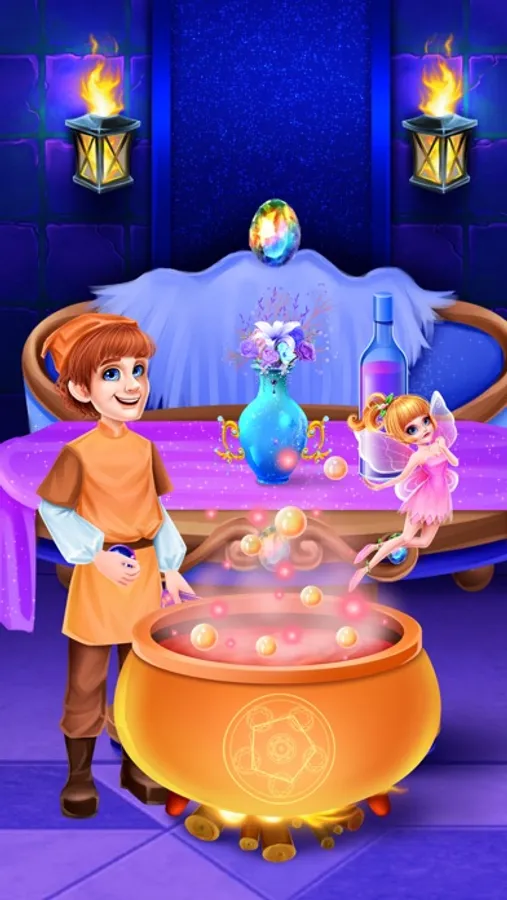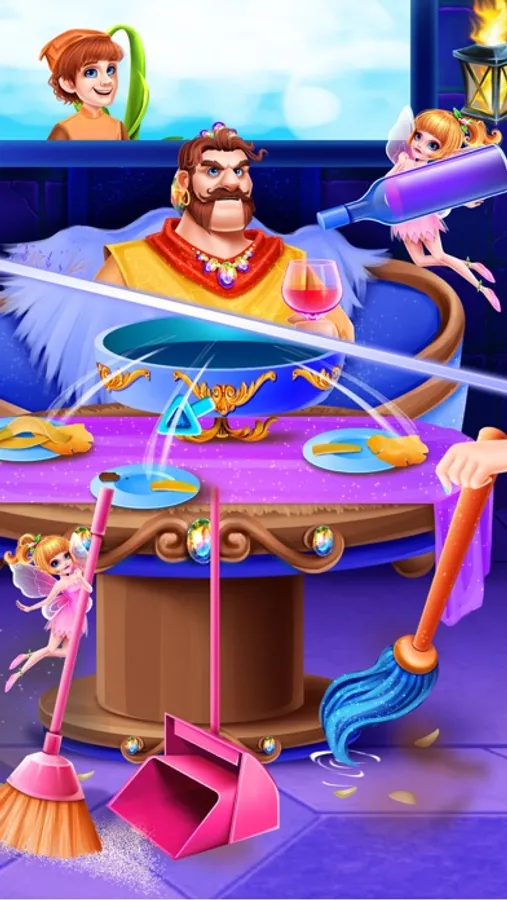 3.Mike comes to a castle where there lives a giant and a fairy then helps the spirite clean up the room and make wine.