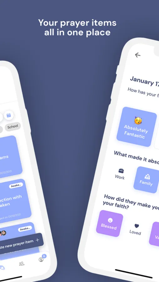 Awaken Prayer is an app to empower Christians in prayer. We're growing a community of Christians who want more intentional and connected prayer. Through Awaken, we help you keep track of all your prayer items, journal about your faith, while also sending out prayer requests to your friends, and guiding you through intentional prayer. Explore more about your faith through empowering articles and feel connected through daily motivations. Welcome to Awaken.