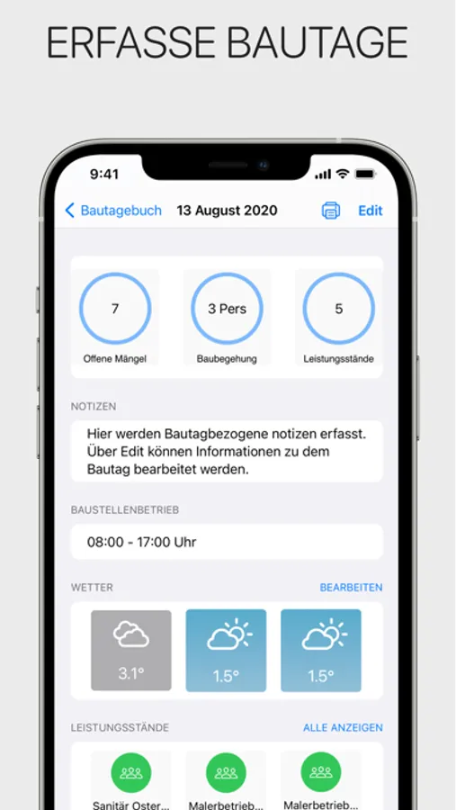 Das Bautagebuch in ProCapture hilft dir dabei alle Informationen aufzunehmen. Mängel, Leistungserfassungen, Begehungen – für alle Daten findet sich ein passender Platz. Die Mediathek des Bautagebuchs nimmt Fotos, PDF´s, Pläne und alle anderen Dateien, die du zu dem Bautag speichern möchtest, auf. Lasse Gewerke, Bauherren oder andere Personen über die Abnahmefunktion im Bautagebuch direkt auf deinem Device unterzeichnen.