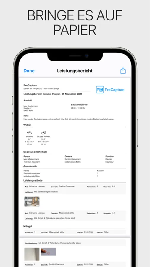 Die Daten, die in ProCapture erfasst werden, kannst du exportieren. Verschicke ein PDF Dokument sofort von deinem iOS Device. Lass dir deinen Baubericht in wenigen Schritten drucken.