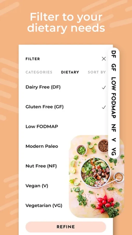 • Filter recipes via GF, DF, V, VG, NF, Low FODMAP and Paleo