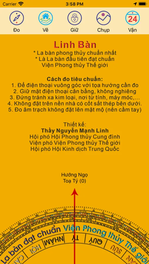 La bàn phong thủy chuyên nghiệp và chính xác nhất, là phần mềm không thể thiếu của một chuyên gia phong thủy thực thụ. App đã loại bỏ độ nhiễu từ trường, đồng thời báo cho bạn biết là đang bị nhiễu bao nhiêu. Ngoài ra, đây là la bàn duy nhất có độ đo chính xác đến 0.001 độ chấp mọi trường phái phong thủy. Kết quả hiển thị qua ba trường phái cơ bản là Huyền không, Đại quái, Tinh tượng. Có đầy đủ cả 9 vận nên bạn dễ dàng đối chiếu với bất cứ niên đại nào, rất tiện để xem lại các công trình kiến trúc cổ như cung đình, lăng mộ cổ. Ngoài ra kết hợp bản đồ địa hình giúp bạn tầm long dễ dàng hơn.