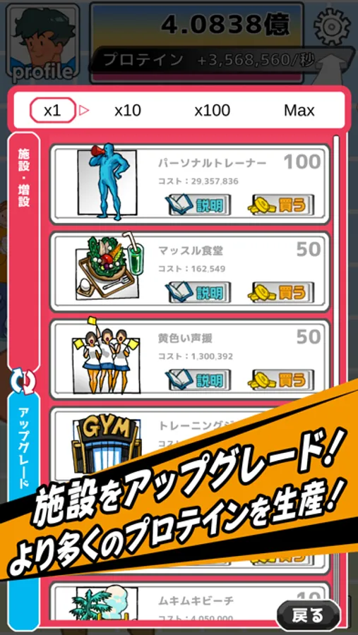 プロテインを使って施設を獲得・増設・アップグレード!