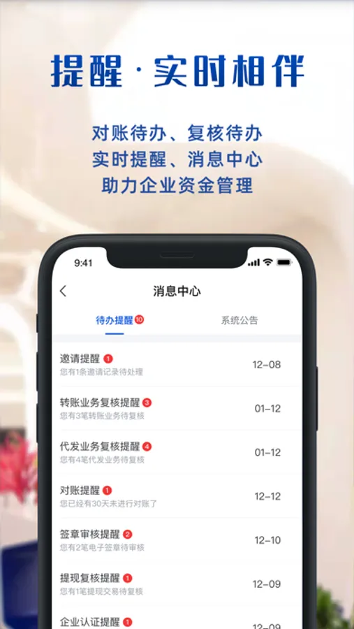 对账待办、复核待办实时提醒,消息中心助力企业资金管理。