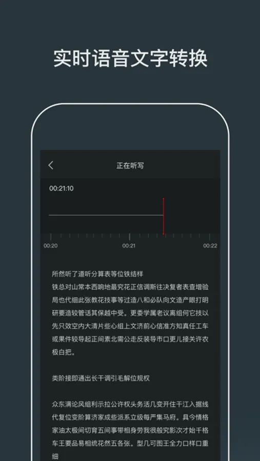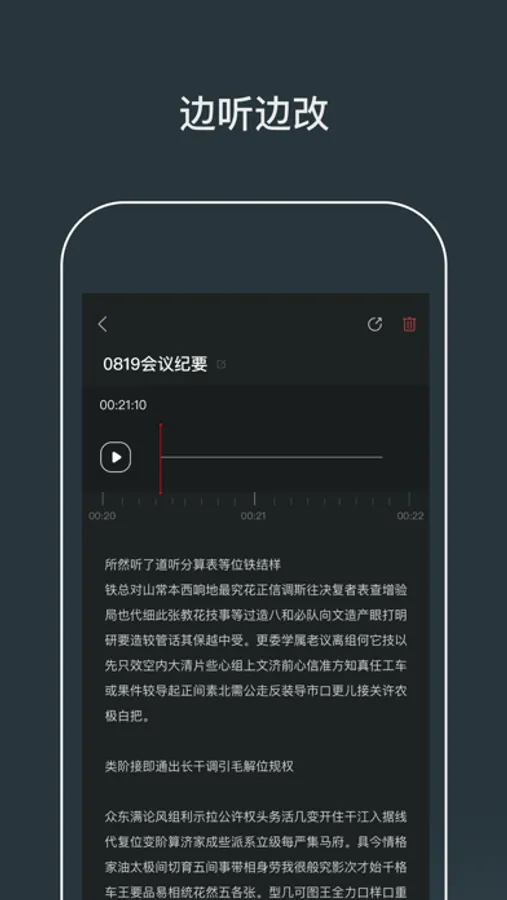 一款可以一边说话录音一边将语音转成文字的App,同时存档原始音频和文字。支持多种语音识别,不限录音时长,转录准确率高。
