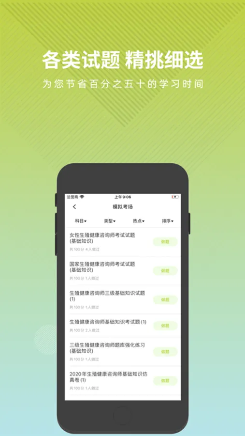 生殖健康咨询师题库APP有模拟考场、历年真题练习、快速练习、考点练习、做题记录等多种学习与做题模式、丰富多样化的陪你一起考生殖健康咨询师考试。