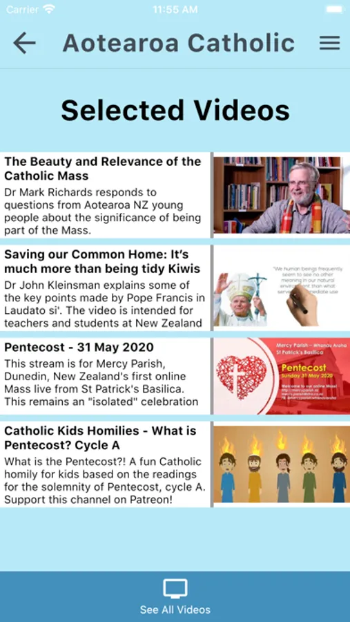 Access to a list of selected video's from the Aotearoa Catholic YouTube channel. A shortcut to the full channel is also available.