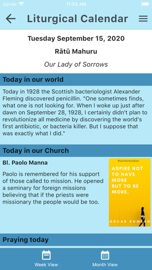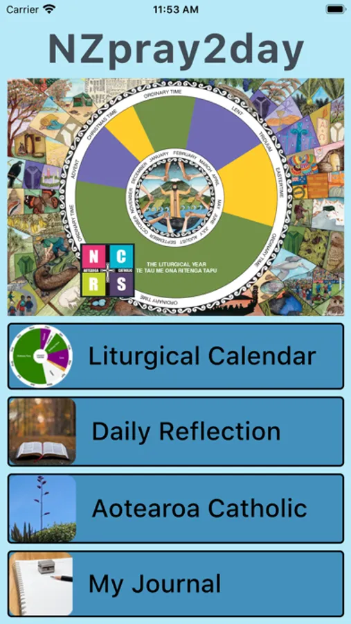 Day, week and month view of the liturgical year with seasonal information, saints days, readings and New Zealand historical facts.