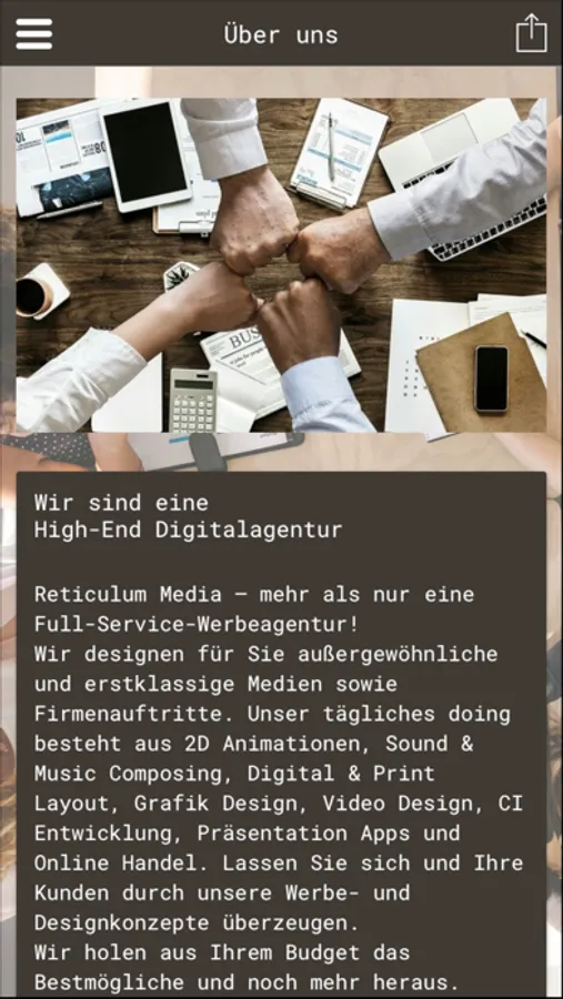 Hierbei handelt es sich um eine App der Reticulum Media UG die zur Präsentation und der Darstellung unserer Leistungen dient. Außerdem können wichtige Infos über die Push-Benachrichtigungsfunktion erhalten werden.