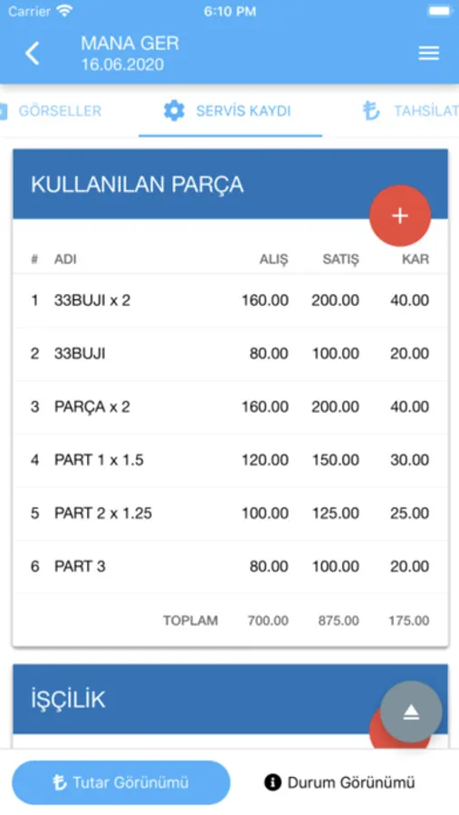 - Parça ve işçilik kayıtları ve ücretlendirilmesi