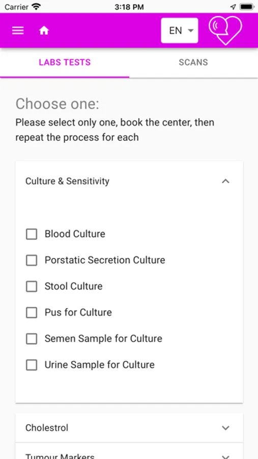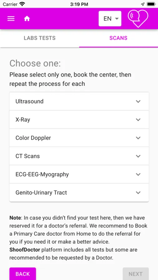 If necessary, the doctor will refer you to a Lab or a Scan Center for test. You’ll find the referrals ready to start the bookings. All final tests reports is saved forever to your Electronic Health Records (EHR) for all your doctor to see in any Video Consult on the system.