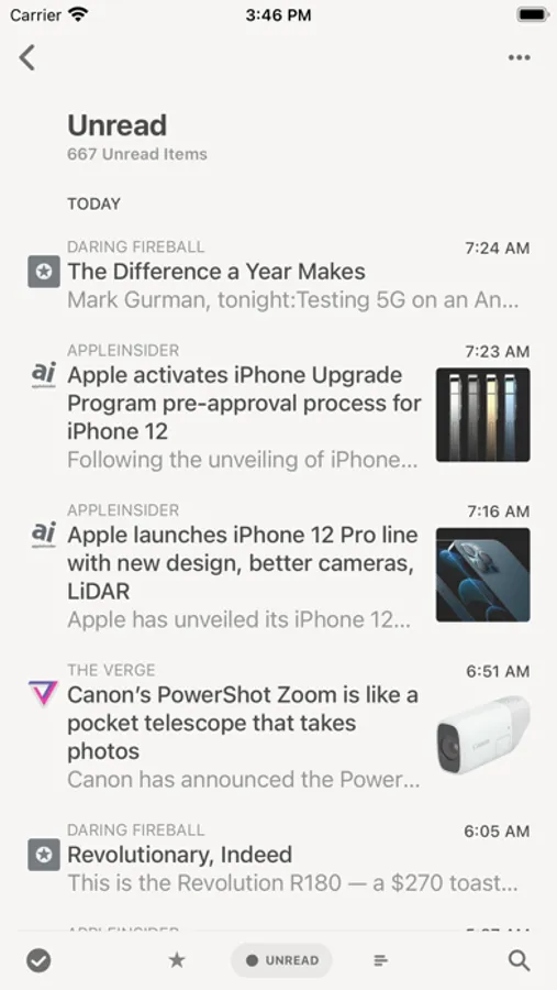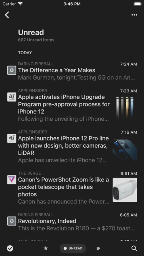 View most recent articles, configurable to only show items from feeds, folders, searches (for services that support searches) or tags (for read later services).