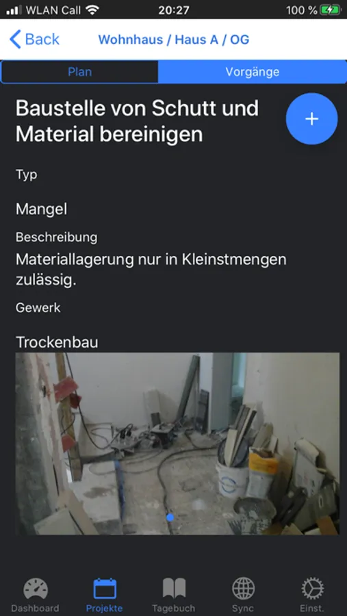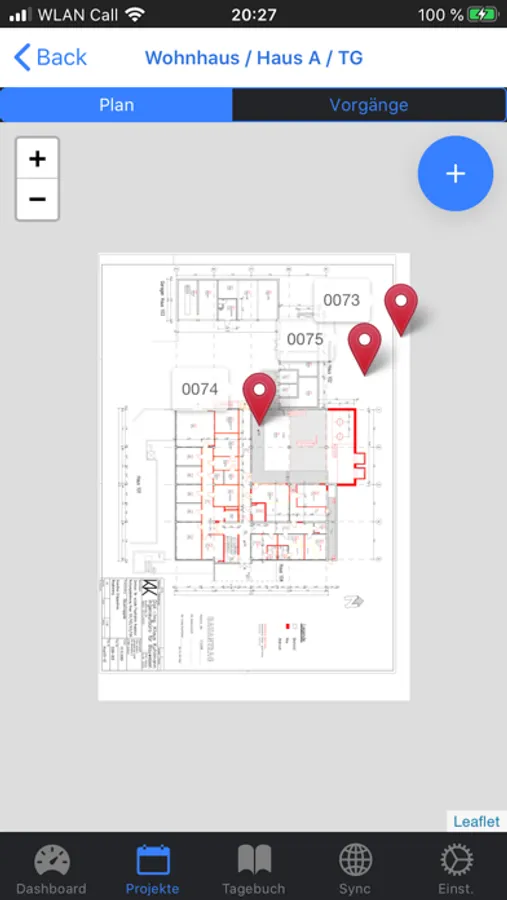 Digitale Baupläne und Verortungen: Auf 2D-Plänen/ Fotos werden Vorgänge markiert + eindeutig positioniert, mit Statusfarbe für den Bearbeitungsstand (Mangel, Freimeldung, Zurückweisung, Wartung, …). Digitale Dokumente werden auf alle Geräte synchronisiert – und die Zusammenarbeit deutlich verbessert.