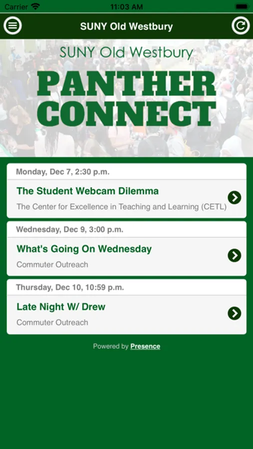 Powered by Presence. Presence provides a web and mobile platform to universities and colleges to help increase student engagement, assess involvement, allocate funding efficiently, and improve retention through simplifying and digitizing processes, collecting, structuring, and analyzing involvement data, and provides tools to help reach and engage more students.
