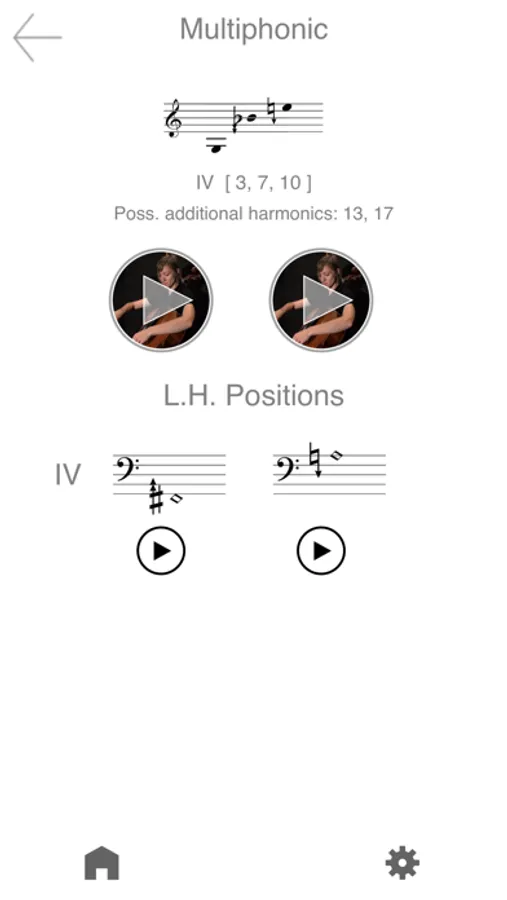 First, choose whether you want to explore cello harmonics or cello multiphonics. Then, use the smart search system to choose your starting point (pitch result, note name, string, left-hand position, harmonic number). Continue to add ‘branches’ to this starting point to filter out options. The filtering system will find a result (or several alternative results) and provide you with notations, audio examples, and videos.