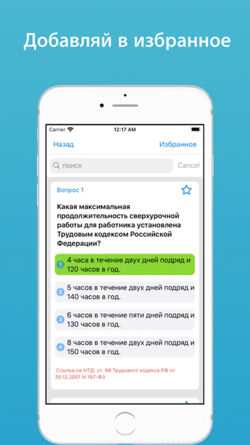 • Работа над ошибками - в режимах "Экзамен", "Марафон" и "Тренировка в избранном" Вы можете сделать работу над ошибками.