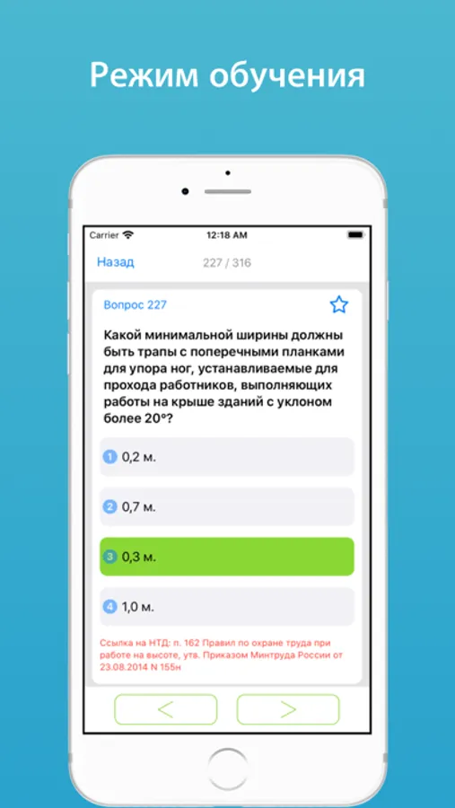 Данный тест-тренажер предназначен для подготовки к первичной и периодической проверки знаний работников 2 группы по безопасности работ на высоте без применения средств подмащивания, выполняемых на высоте 5 м и более, а также выполняемых на расстоянии менее 2 м от неогражденных перепадов по высоте более 5 м на площадках при отсутствии защитных ограждений либо при высоте защитных ограждений, составляющей менее 1,1 м