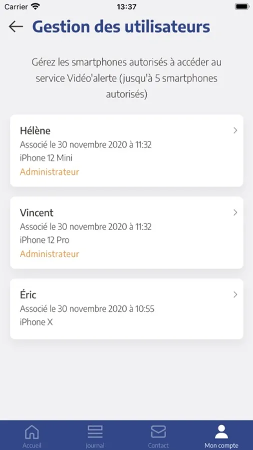 Le service Vidéo’alerte vous permet de créer jusqu’à 4 comptes sur l’application mobile, avec 2 profils possibles : jusqu’à 2 profils administrateurs et 2 profils utilisateurs.