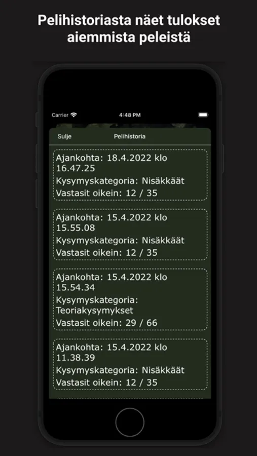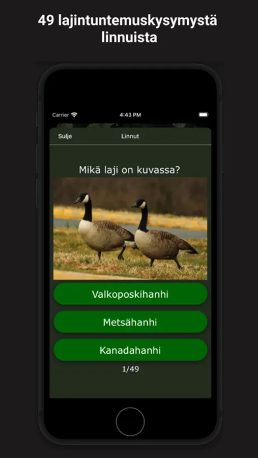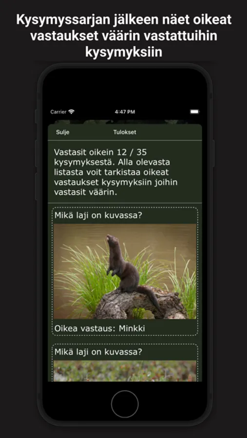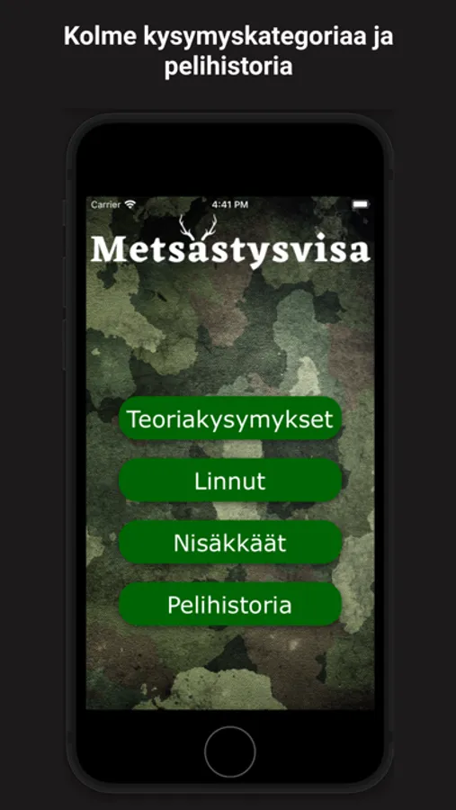 Metsästyvisa on appi jolla voit helposti ja kätevästi harjoittella metsästäjätutkintoa varten älypuhelimella, kolmella eri kysymyskategorialla. Voit harjoitella teoriakysymyksiä tai lajintuntemuskysymyksiä linnuista ja nisäkkäistä. Metsästysvisa auttaa valmistautumaan metsästäjäntutkintoa varten. Ei vaadi rekisteröitymistä eikä sisällä markkinointia.