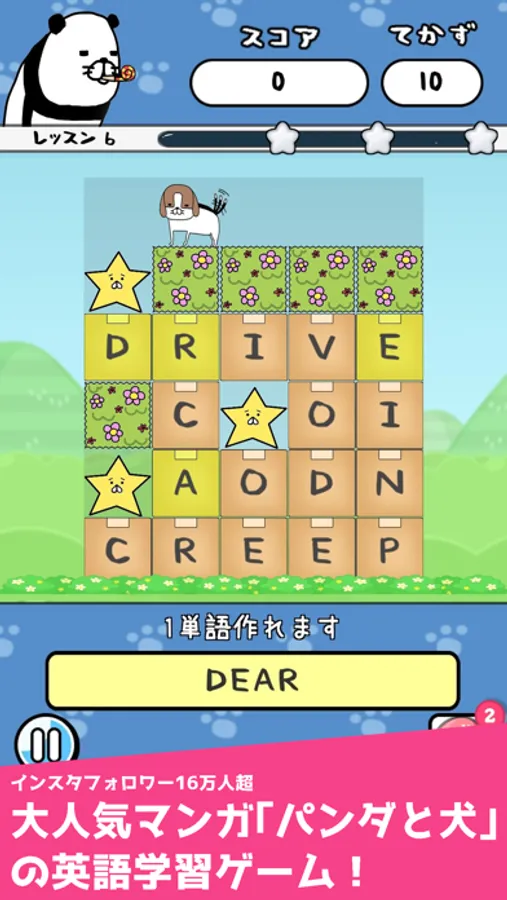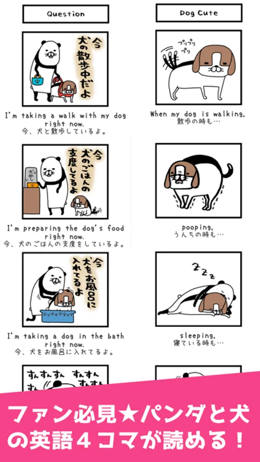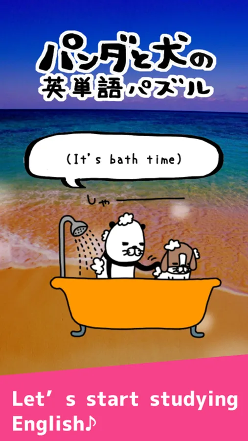 ほのぼの雰囲気が可愛い、英単語パズルゲームやパンダと犬の英語4コマで、楽しく英語が身につくよ!