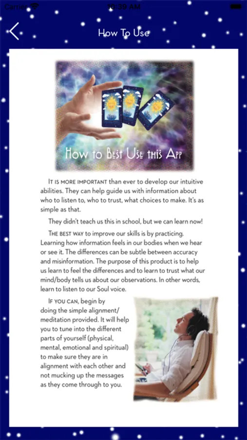 This all in one app is a tool to help you develop your intuition. You start by doing an easy alignment meditation, even if you have never meditated. Then you draw your message card for the day. That is automatically entered in your journal so you can observe how the message plays out in your life. That practice helps you learn to listen to your higher self, your soul voice.