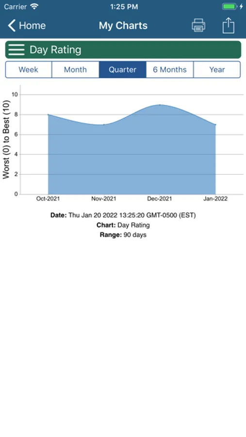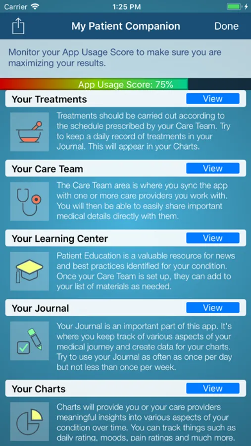 • Track your progress and symptoms by filling in the daily journal with its sliders and buttons and watch your data transform into easy-to-read charts
