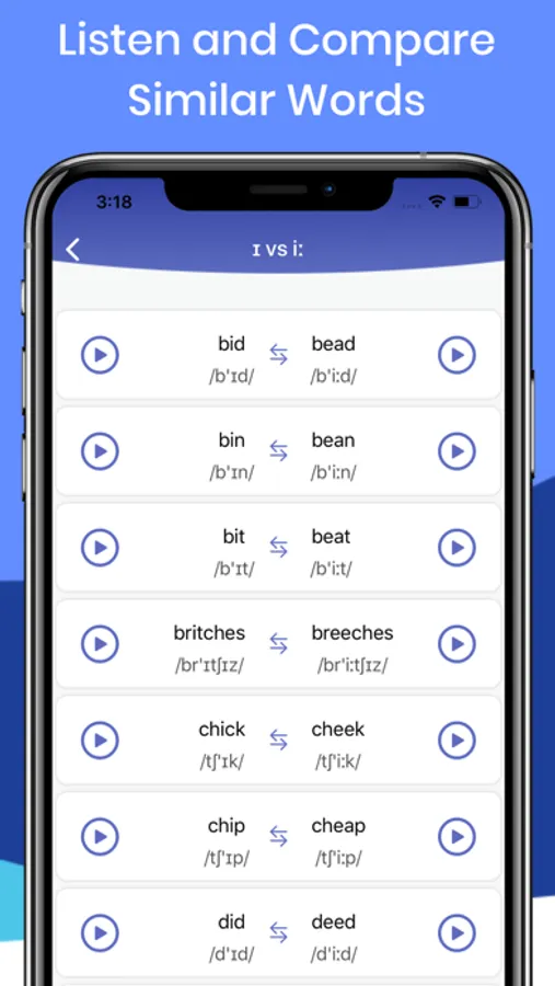 Listen and compare 8,000 minimal pairs in real British English or American English voice. Practice English pronunciation with British and American accent practice mode. Hear how to pronounce English words and practice.