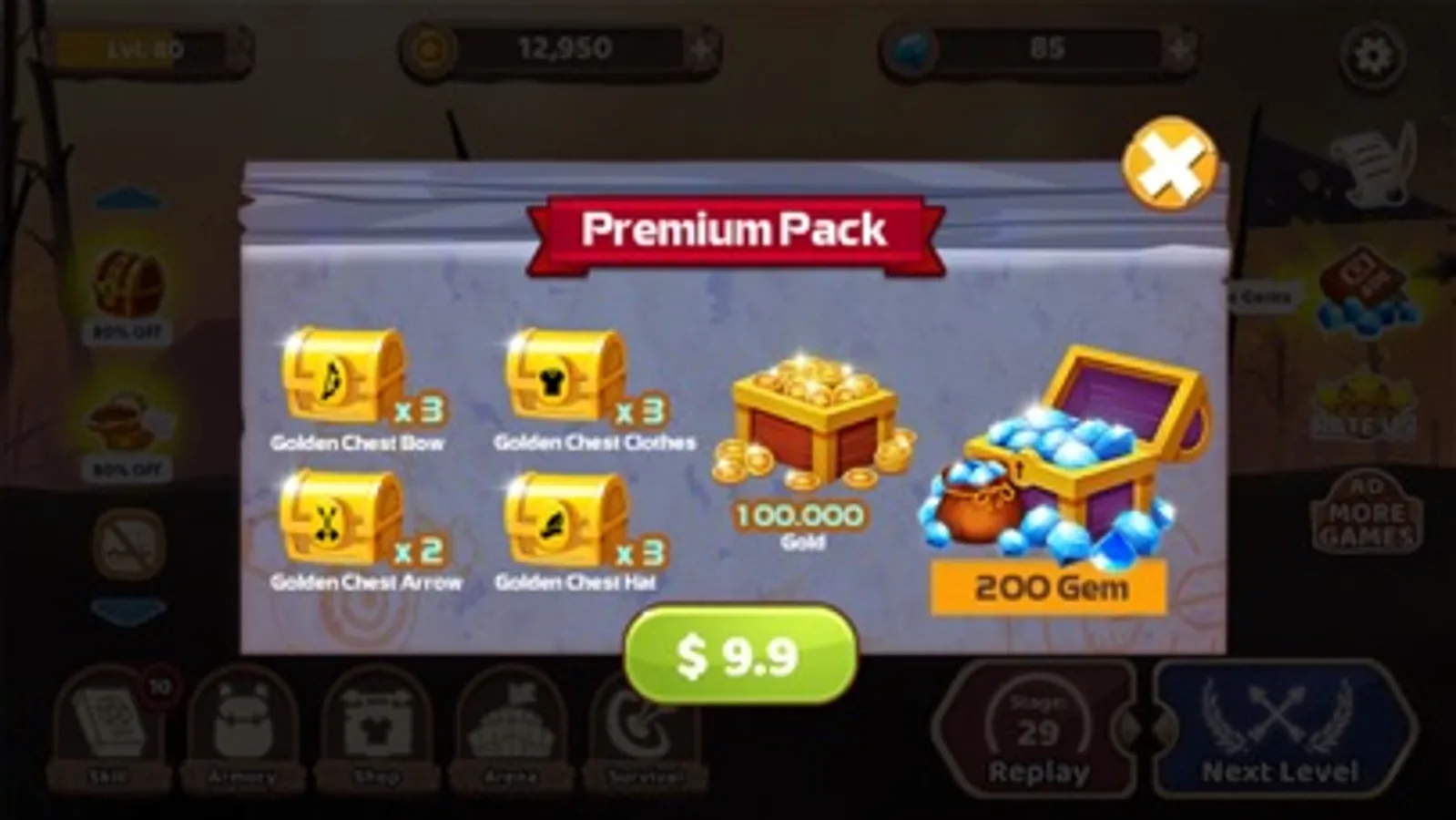 The difficulty of Mr. Archer will increase gradually, so you need to aim accurately and shoot arrows as fast as possible with extremely effective support such as armor, increased attack power and health.